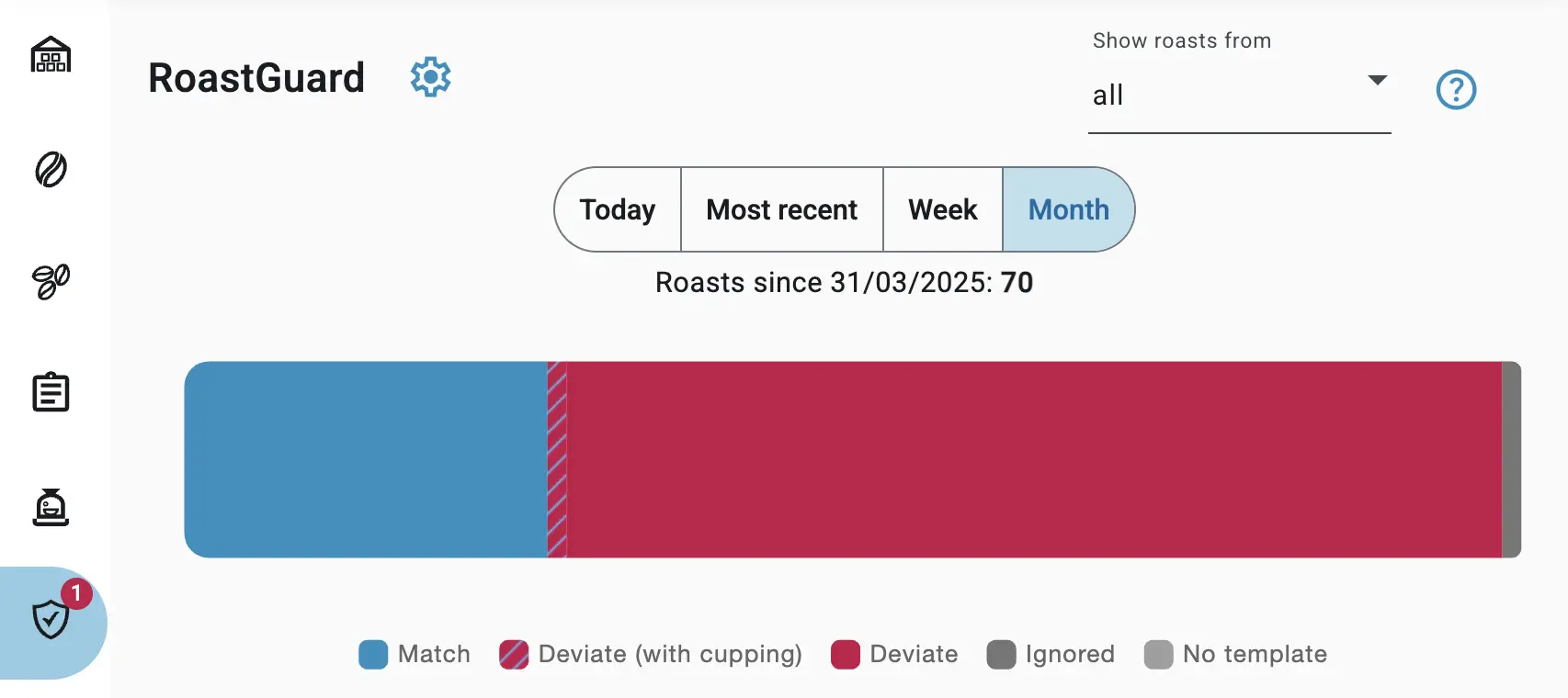 The RoastGuard tab presents a comprehensive chart that outlines the ratio of roasts that achieved your desired outcomes, those that fell short of your goals, and those that were not evaluated.