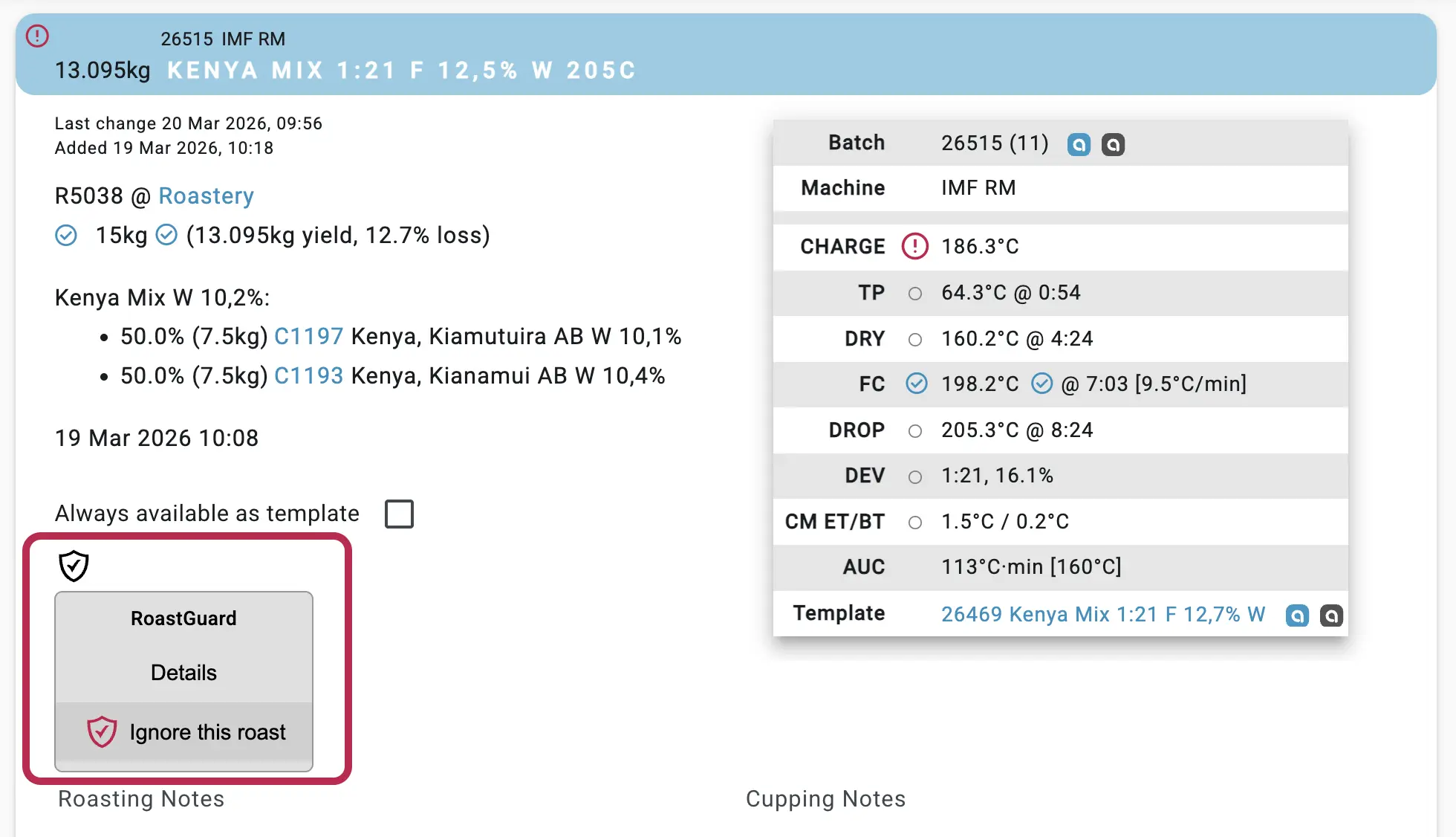 If the setting Ignore cupped roasts for RoastGuard on top of the settings page is checked, roasts with cupping results are assumed to be verified and therefore count as having been evaluated.