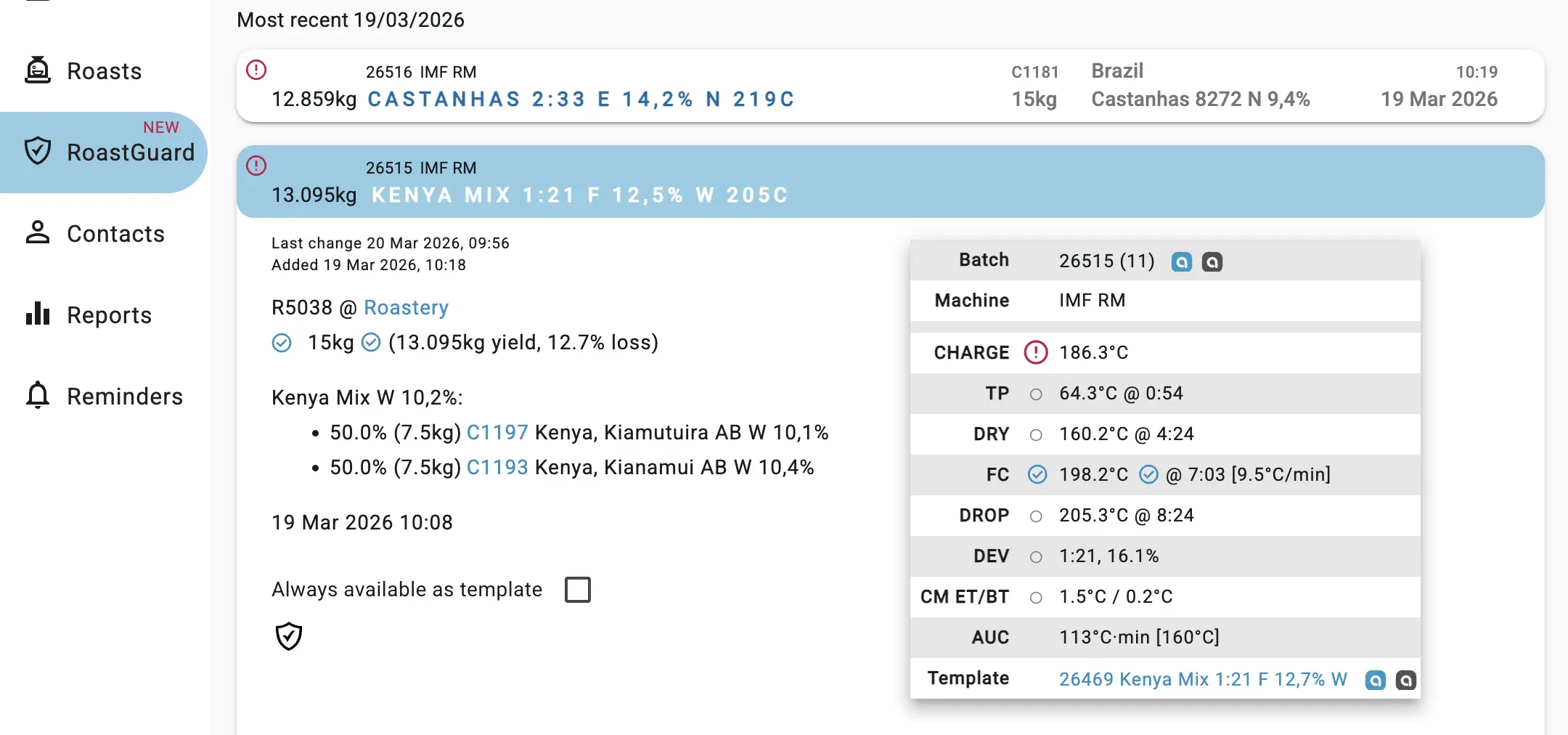 RoastGuard allows you to define acceptable deviations for critical roasts parameters relative to its template profile. RoastGuard automatically identifies roasts outside these limits, not meeting your quality standards, for cupping.