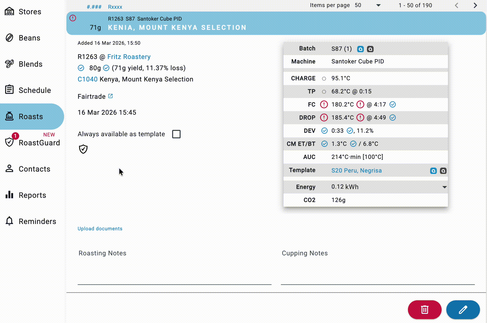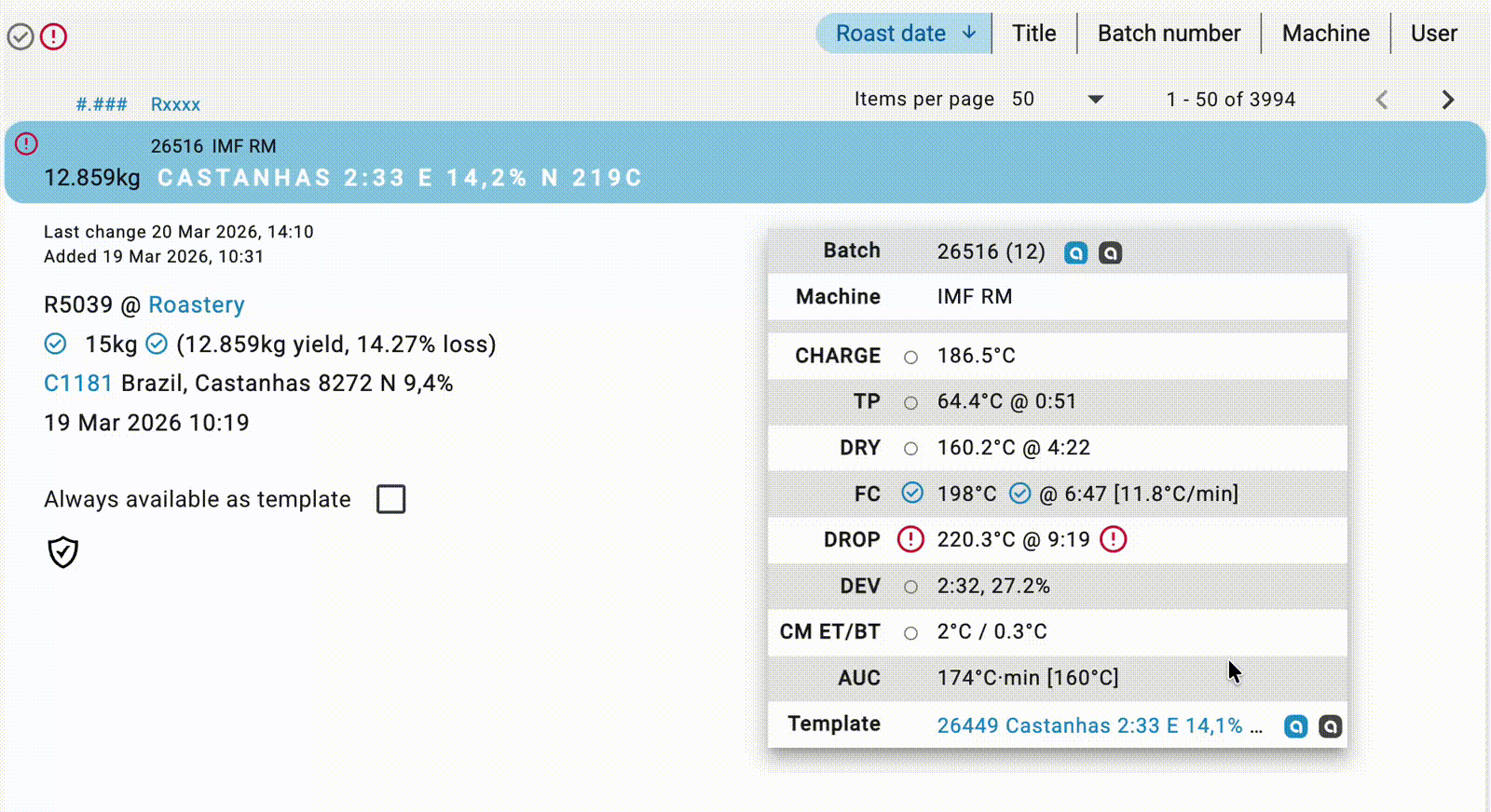 The roasts listed under the Roasts tab are marked with evaluation results in the same way as in this list of deviations. There you can use the RoastGuard icons at the top to filter out roasts meeting your goals and those that did not.